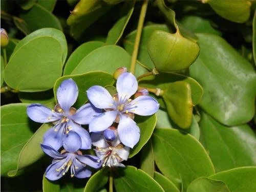 With a canopy of dark green leaves, this excellent multi-trunked shade tree, sprinkled with clear blue flowers in the spring and summer, deserves a place of honor in any garden. Yellow fruits split open to reveal bright red seeds loved by a variety of birds. Skipper butterflies frequent the flowers while new growth provides larval food for the lyside sulphur, a rare butterfly of the Florida Keys.